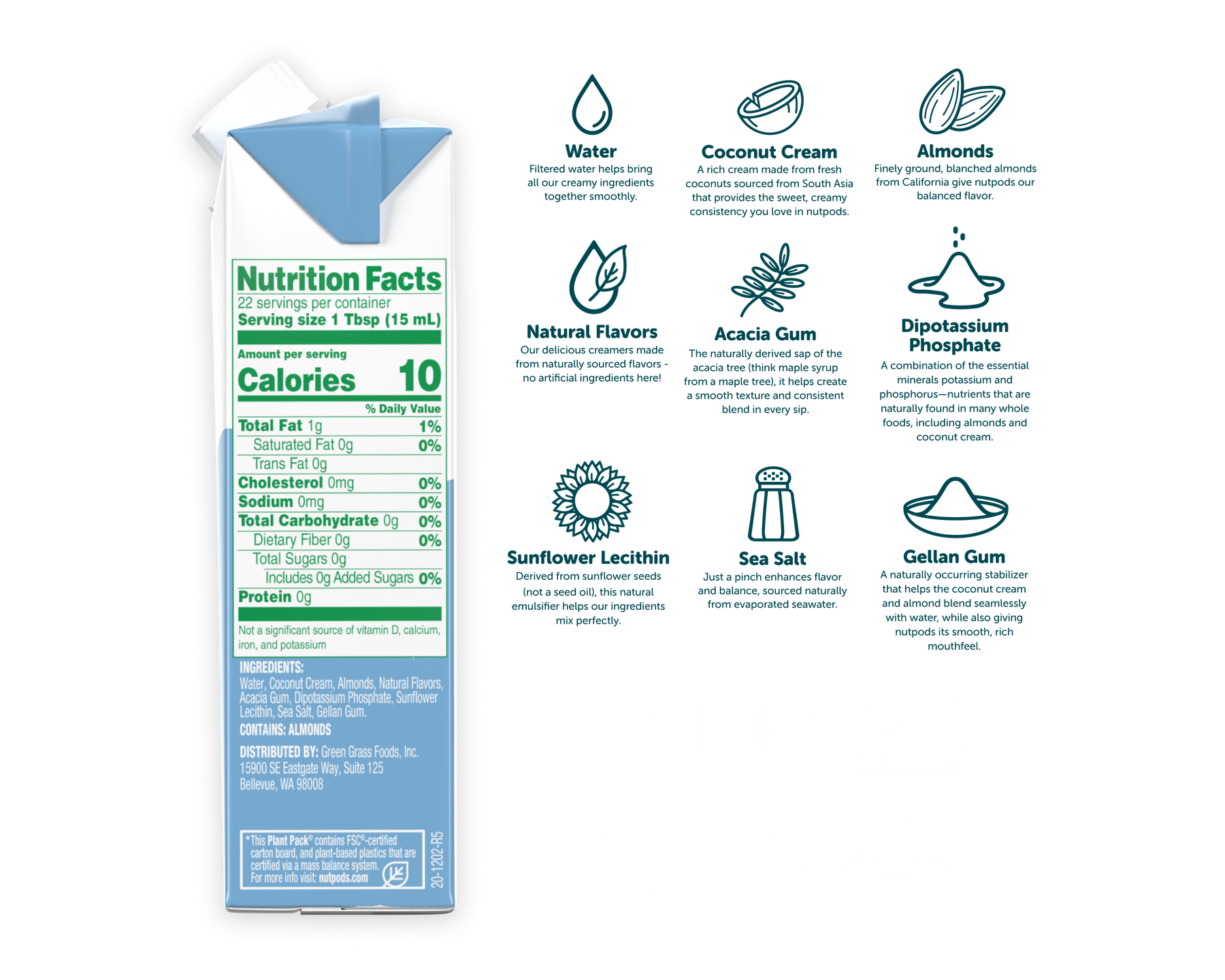 Water, Coconut Cream, Almonds, Natural Flavors, Acacia Gum, Dipotassium Phosphate, Sunflower Lecithin, Sea Salt, Gellan Gum.